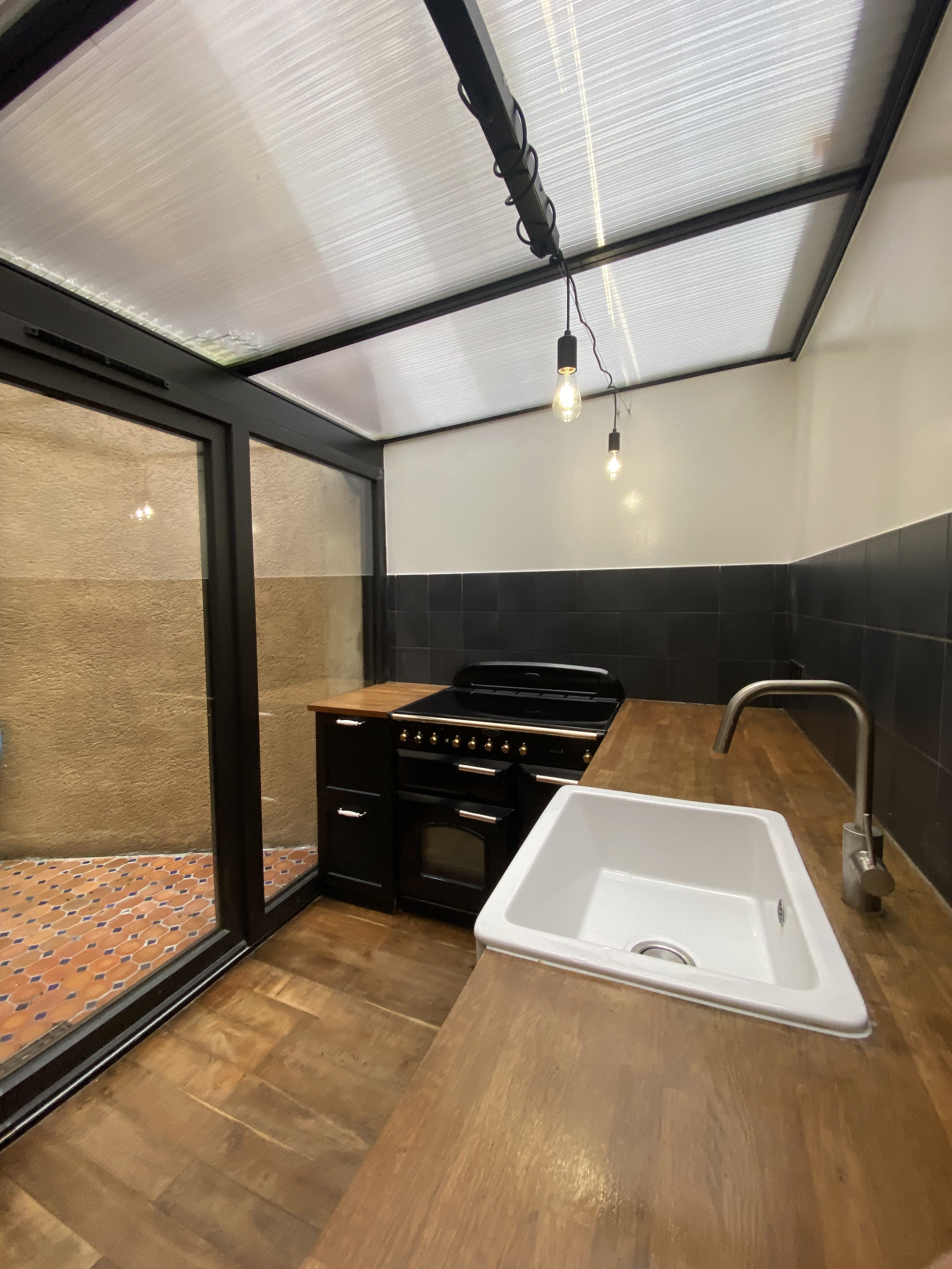 Séjour avec cuisine entièrement équipée sur terrasse, chambre, salle d’eau et wc indépendant.